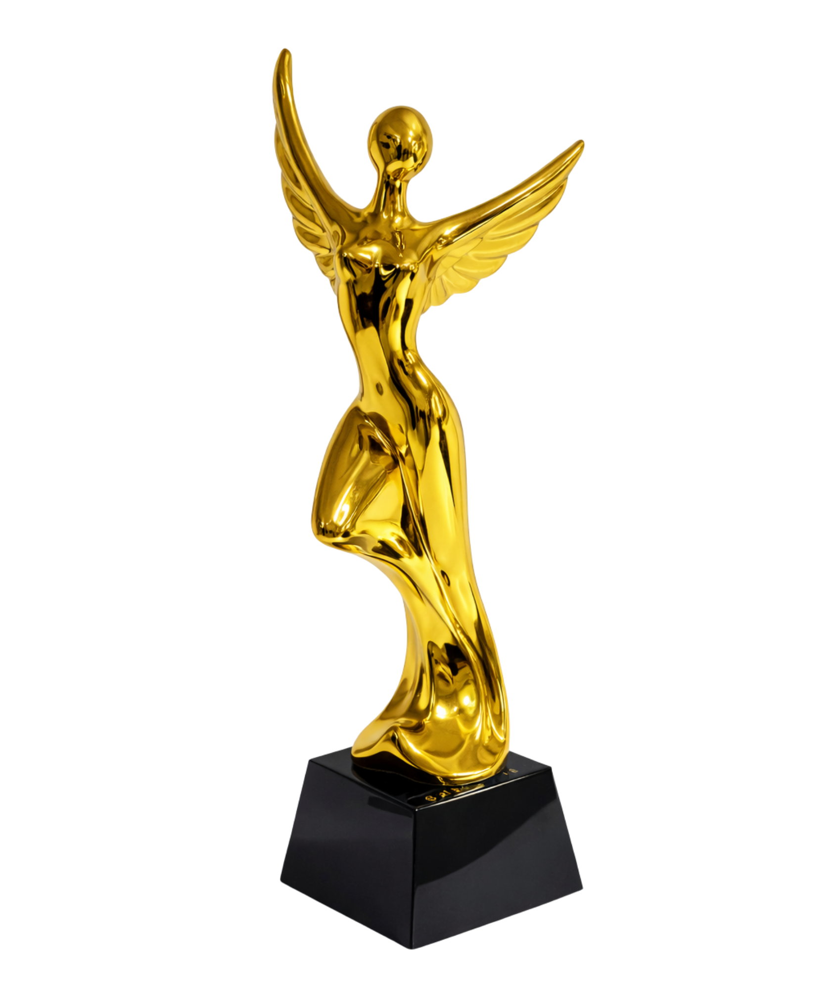 Efektowna złota statuetka o wysokości 30 cm w formie stylizowanej, skrzydlatej postaci to wyjątkowa propozycja na podziękowanie, nagrodę lub prestiżowe wyróżnienie. Smukła sylwetka, dynamiczna forma oraz połyskujące złote wykończenie nadają jej nowoczesny, a jednocześnie bardzo elegancki charakter.