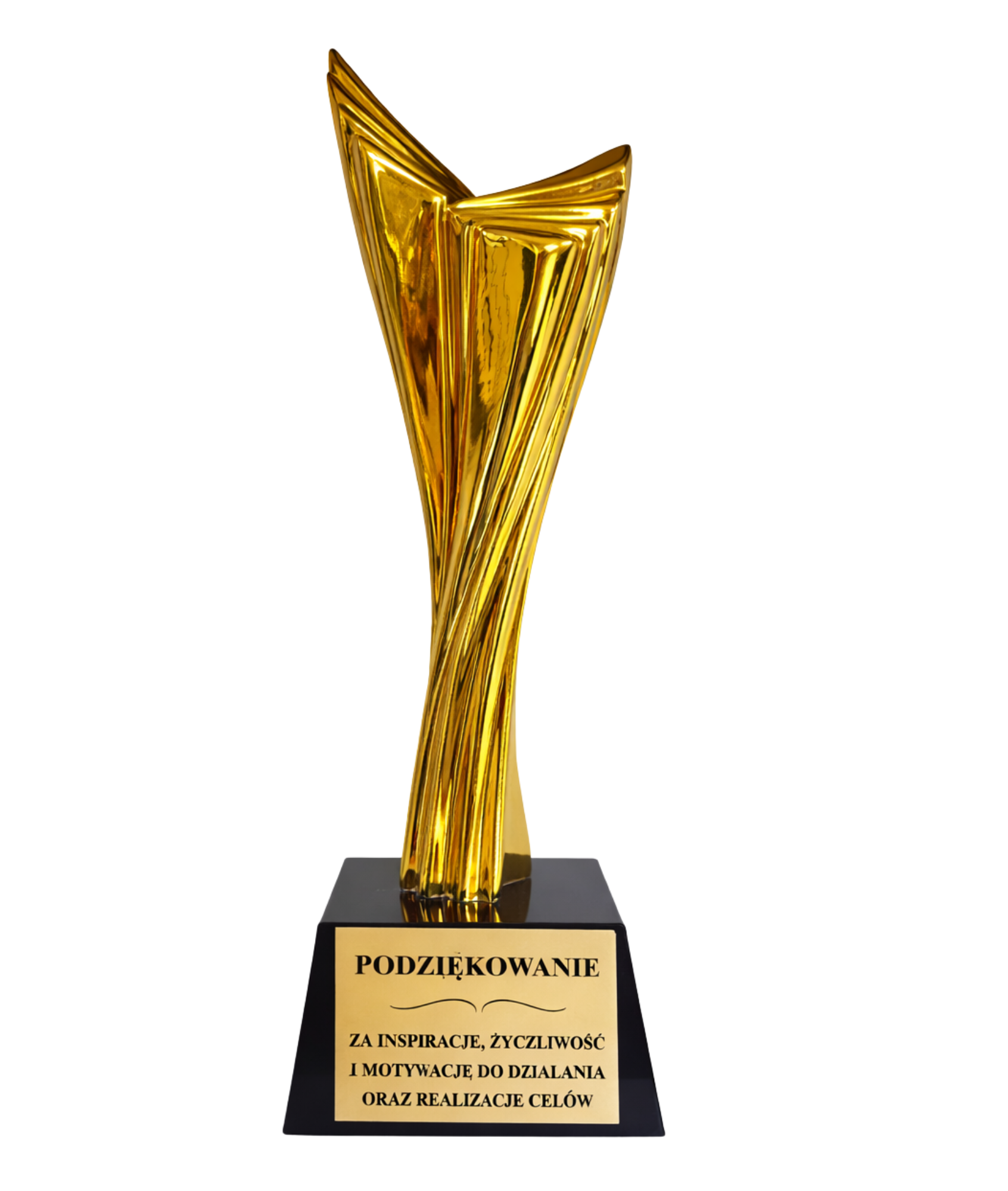 Nowoczesna, złota statuetka o dynamicznej formie to wyjątkowy sposób na wyrażenie wdzięczności i uznania. Jej smukły kształt oraz połyskujące, złote wykończenie przyciągają wzrok i nadają całości prestiżowego charakteru. Idealnie sprawdzi się jako podziękowanie, wyróżnienie lub nagroda okolicznościowa.